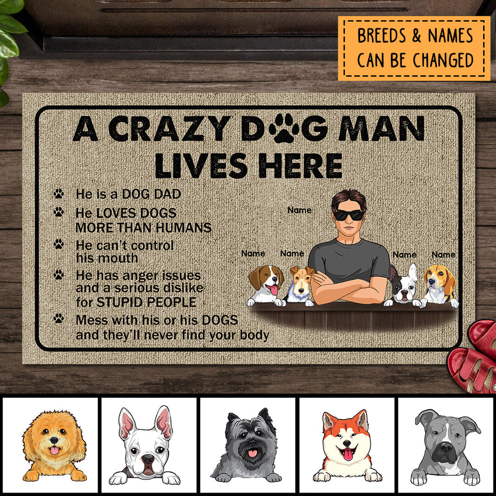 Dog Lover Custom Doormat, A Crazy Dog Man Live Here Personalized Gift For Dog Dad, Funny Warning Mat