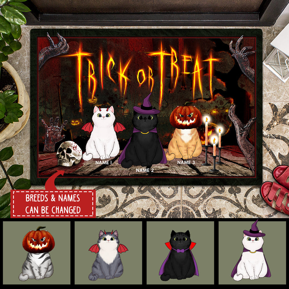 Trick Or Treat - Pumpkin Carving, Witch & Dracula Cloak, Devil Wings - Personalized Cat Halloween Doormat