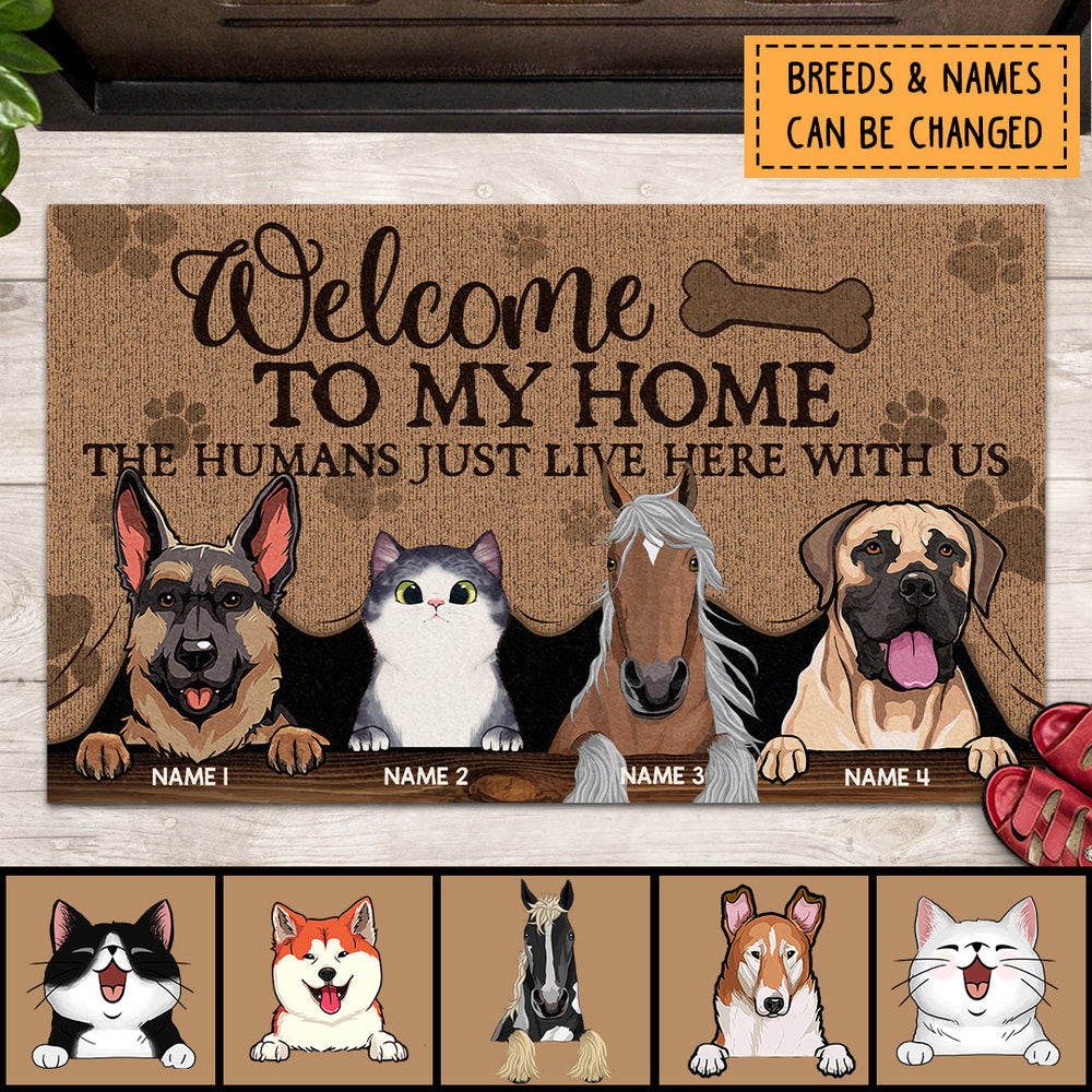 Welcome To Our Home The Humans Just Live Here With Us, Peeking From Curtain, Personalized Dog & Cat & Horse Doormat